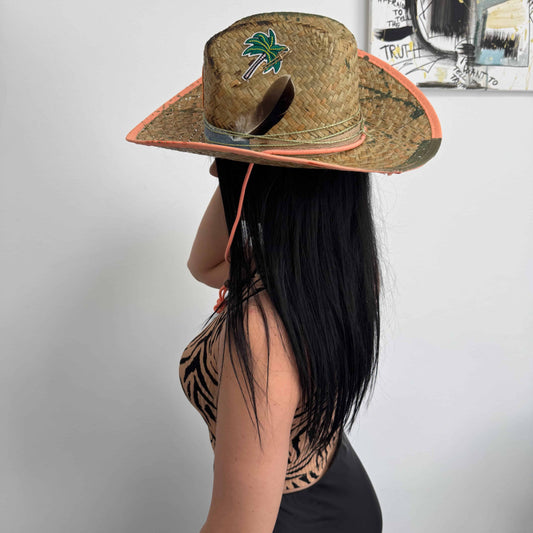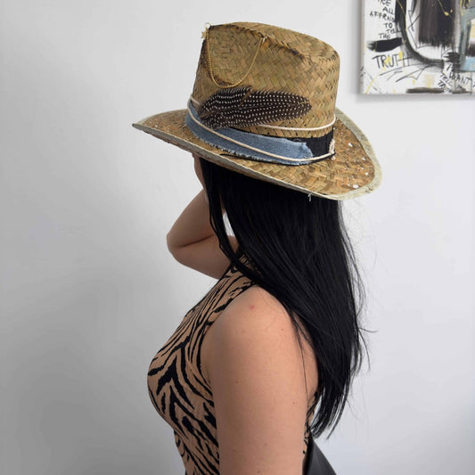 Palarie maro, stil cowboy, de paie, handmade, pictata si accesorizata manual, Mallorca