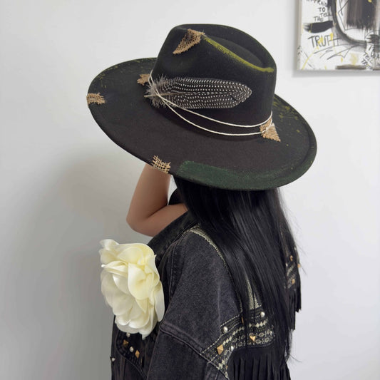 Palarie neagra, cu bor lat, handmade, pictata si accesorizata manual, Abby